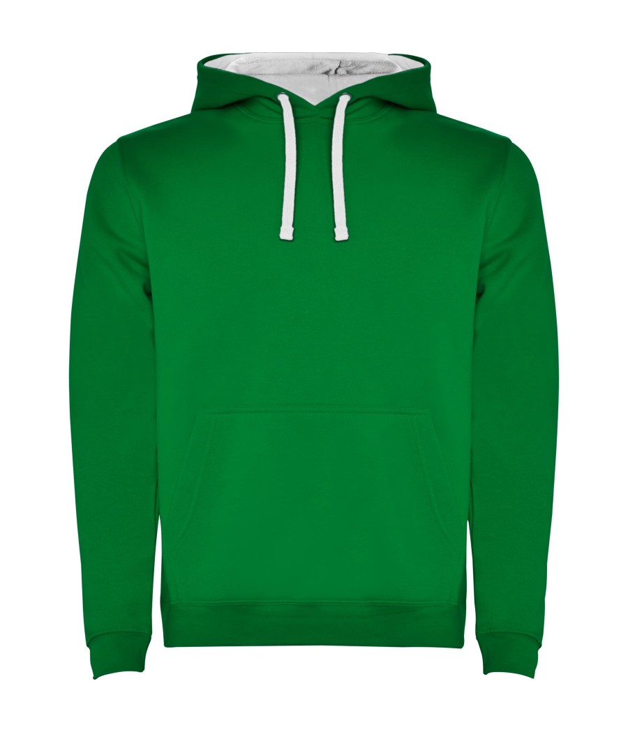 Dwukolorowa bluza z kapturem z podwójnej tkaniny ze sznurkowym ściągaczem. Kieszeń w stylu kangurka. Elastyczne ściągacze przy mankietach i w pasie. Rozmiary dziecięce bez sznurkowego ściągacza przy kapturze.