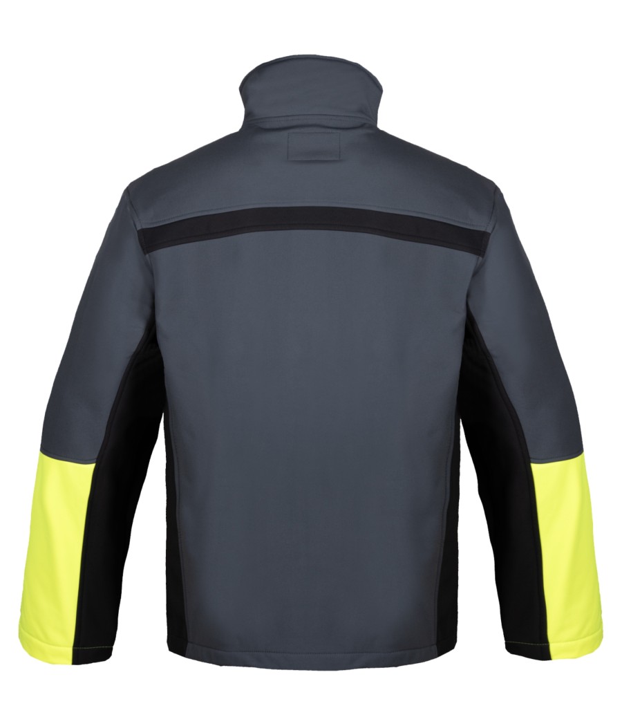 Nowoczesny design: Atrakcyjne połączenie koloru ciemnoszarego z czarnymi i kontrastowymi, żółtymi wstawkami, nadające kurtce profesjonalny i dynamiczny wygląd.
