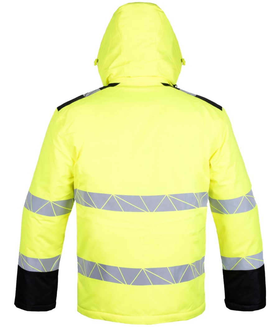 Certyfikowana widoczność: Zgodność z normą EN ISO 20471:2013 (Klasa II) dzięki fluorescencyjnemu materiałowi i drukowanym pasom odblaskowym na torsie, plecach i rękawach.